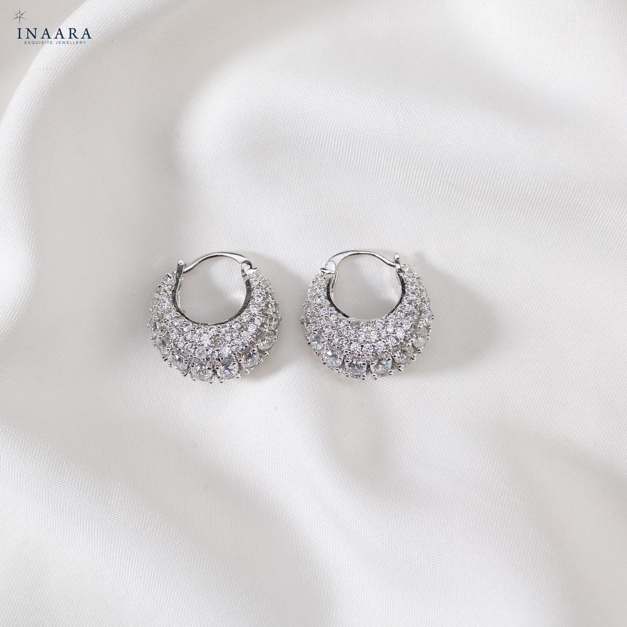 Designed to illuminate. These crescent-shaped hoops shimmer with rows of radiant stones, creating a dome of breathtaking brilliance. The perfect balance of bold and refined, they bring a celestial glow to any look. A true luxury staple — crafted for women who love to shine without saying a word.