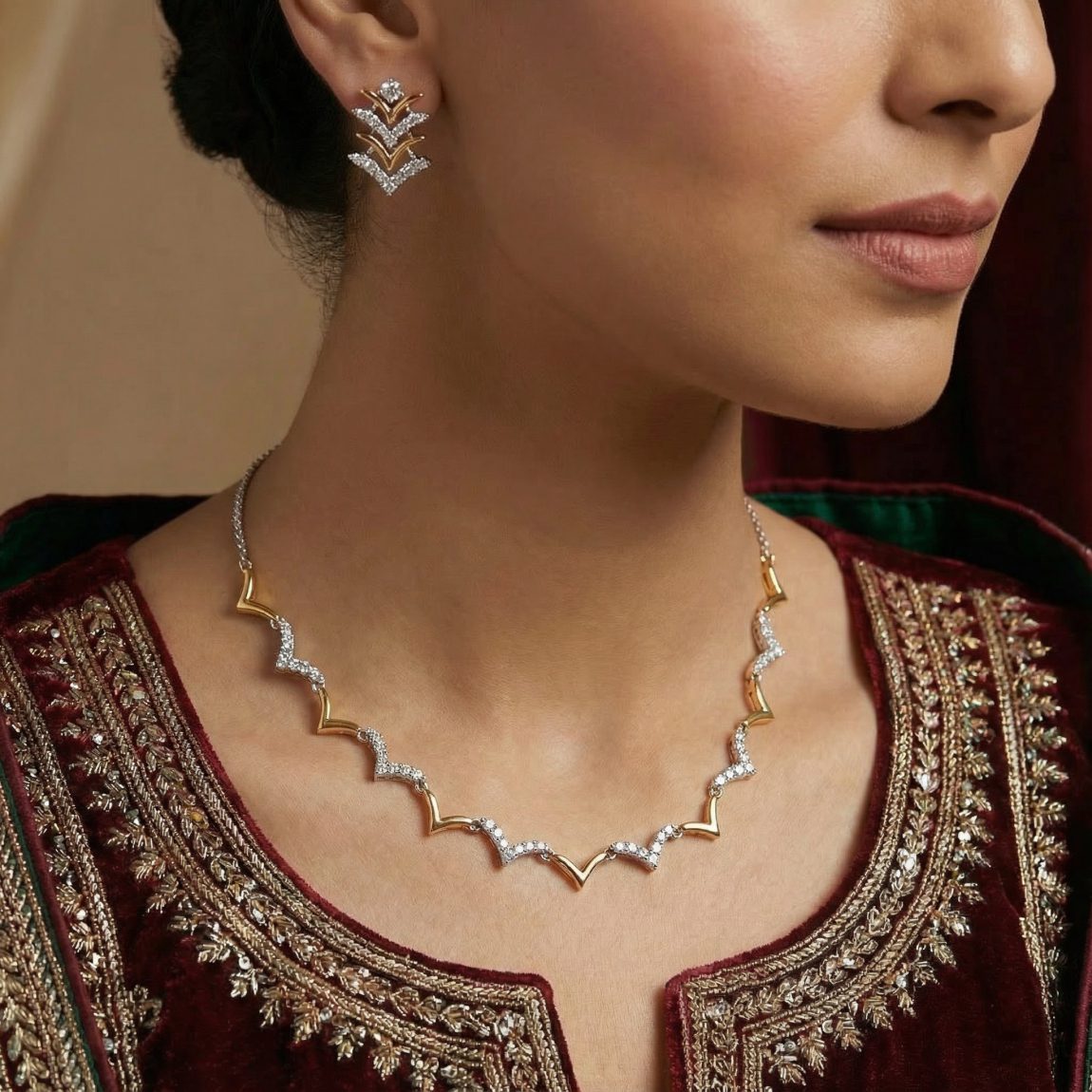 Elevate your style with the Dawn Crest Necklace Set from INAARA, a mesmerizing jewelry set designed for those who command attention. This exquisite collection is crafted from lustrous 925 sterling silver, featuring a dynamic interplay of rich golden and brilliant white plating. Each piece—a striking necklace and matching earrings—showcases a unique chevron design, meticulously set with premium quality zircons that capture and reflect light with the brilliance of natural charm. The set evokes a sense of modern sophistication and timeless luxury, creating a captivating visual rhythm. The ‘Dawn Crest Necklace Set‘ is more than an accessory—it’s a statement of unrivaled elegance and distinguished taste, offering a premium, elite-brand feel that is genuinely attainable.