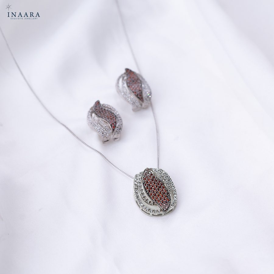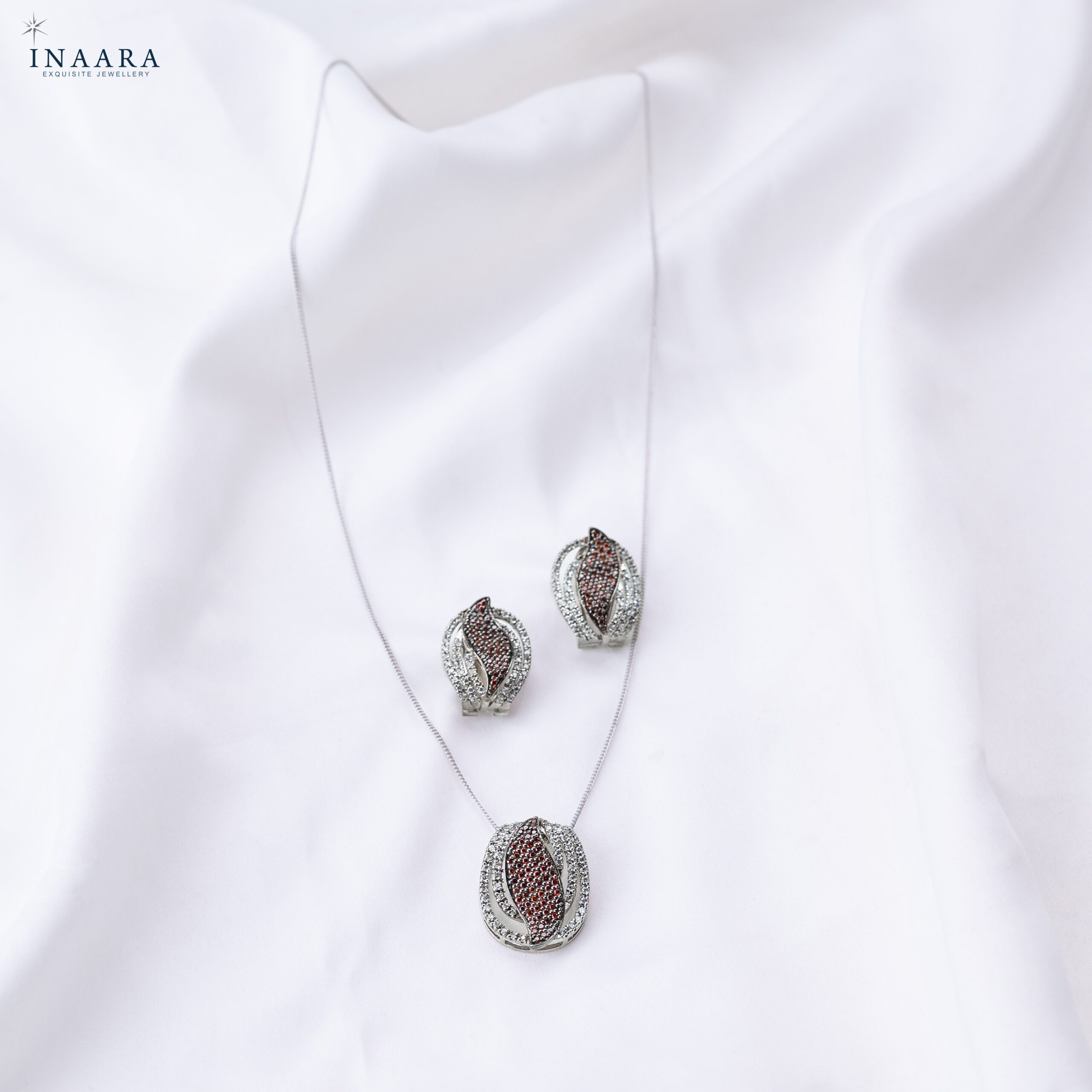An ode to confidence and allure, the Ember Pendant Set radiates with fiery sophistication. Crafted in luminous sterling silver, its flame-inspired design glows with scarlet pavé stones, embraced by rows of dazzling white zircons. Every curve reflects strength and elegance — a tribute to the woman who embodies passion with grace. Bold yet refined, the Ember transforms light into art, igniting every look with a touch of modern luxury.
