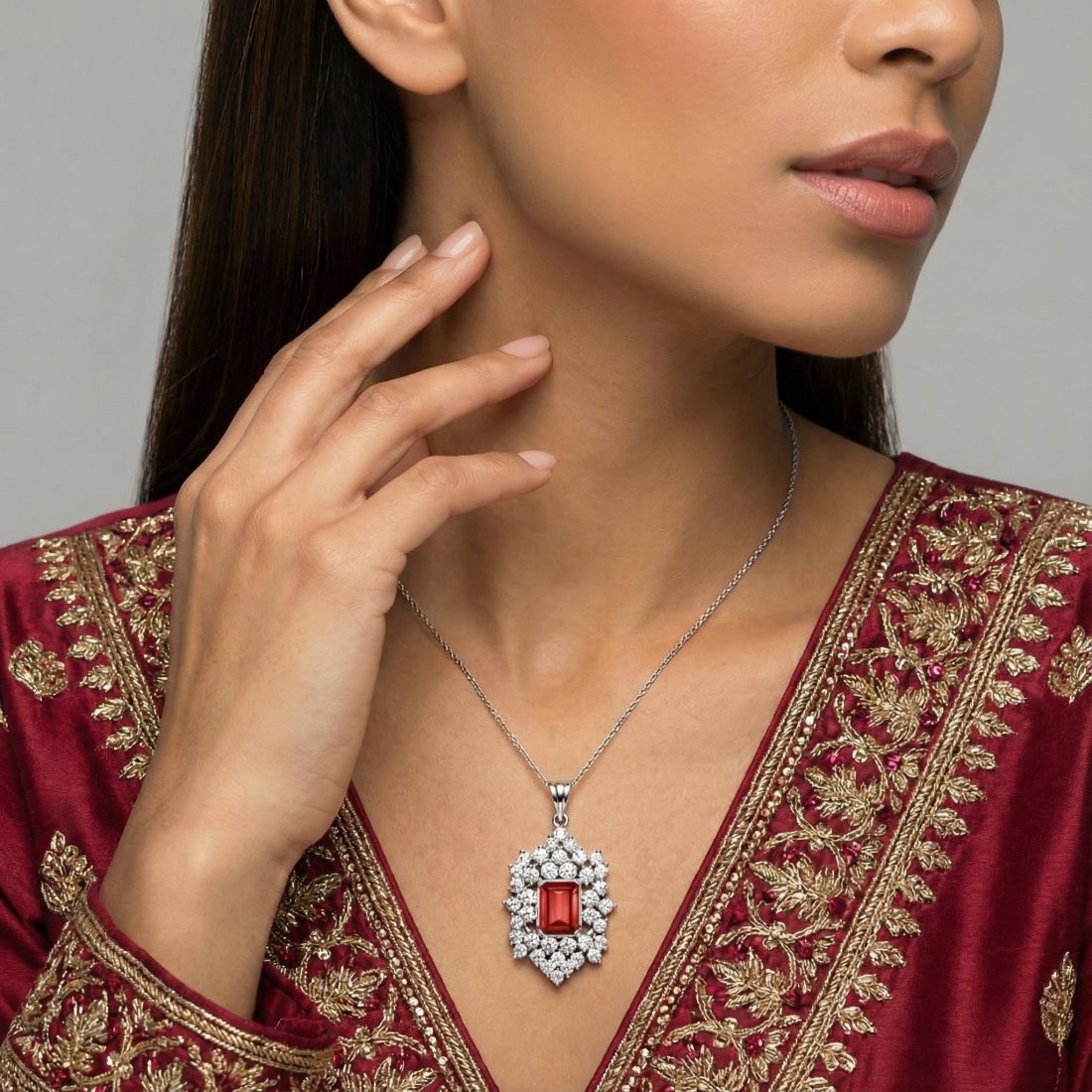 This expertly crafted pendant feature bold red garnet, set in sterling silver coupled with shimmering zircons that have been inspired by nature. The pendant combine red color and exceptional design to symbolize the beauty of nature. Coupled with bold red lipstick you will be the center of attention. Goes with any outfit anywhere.