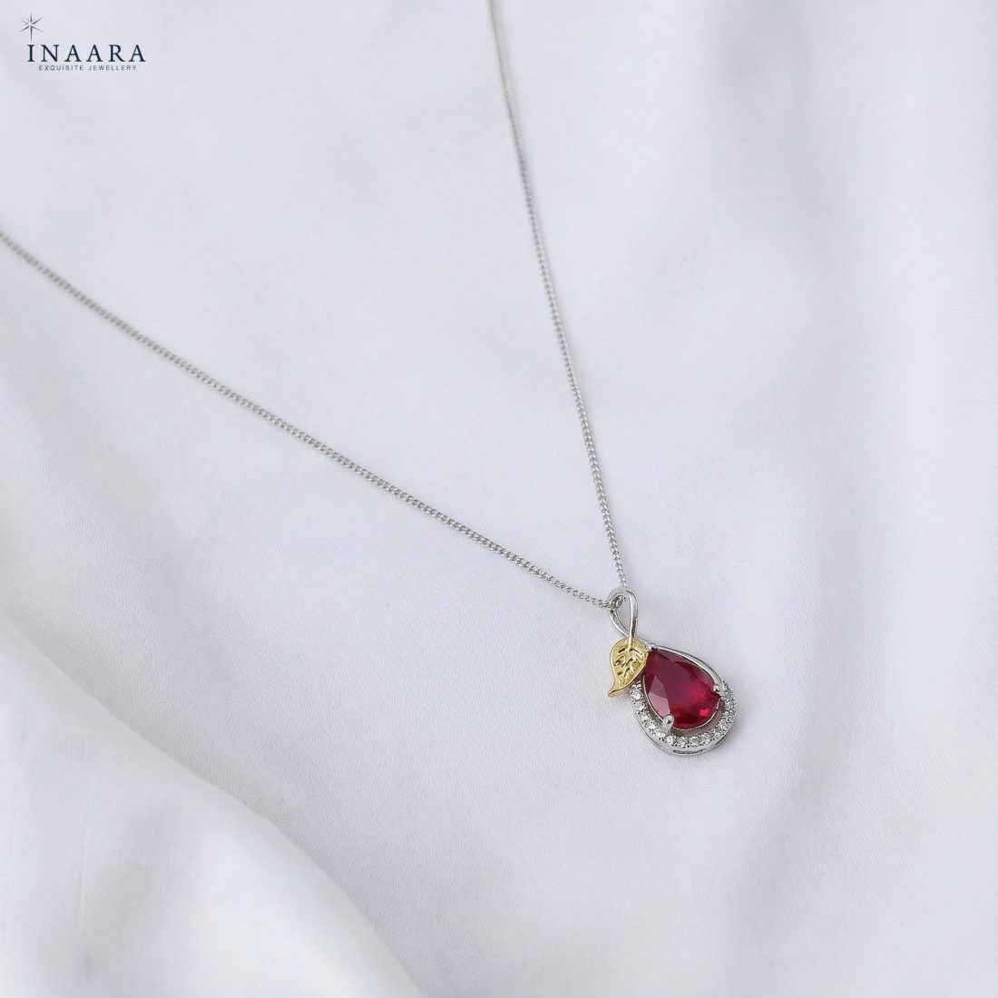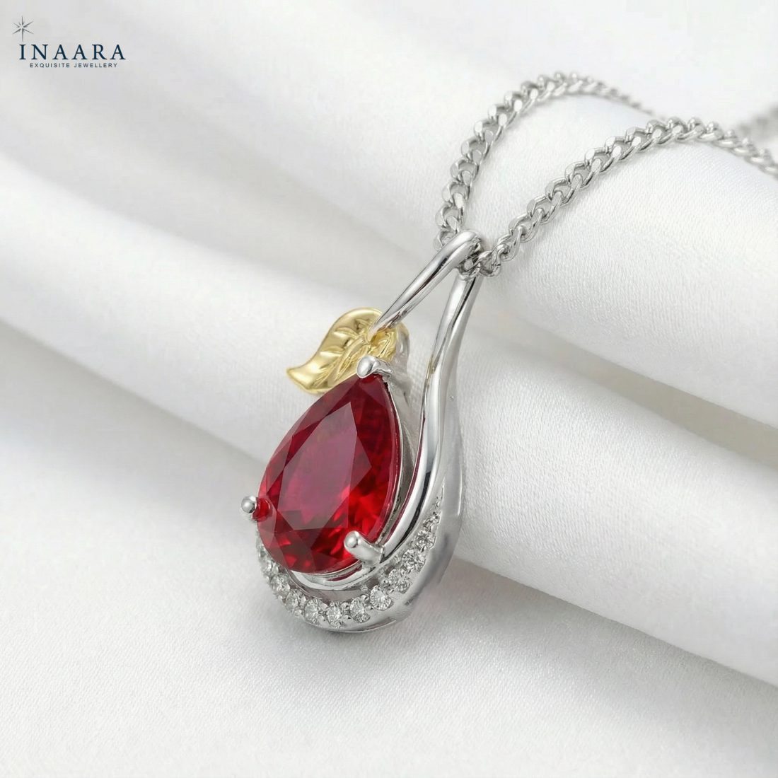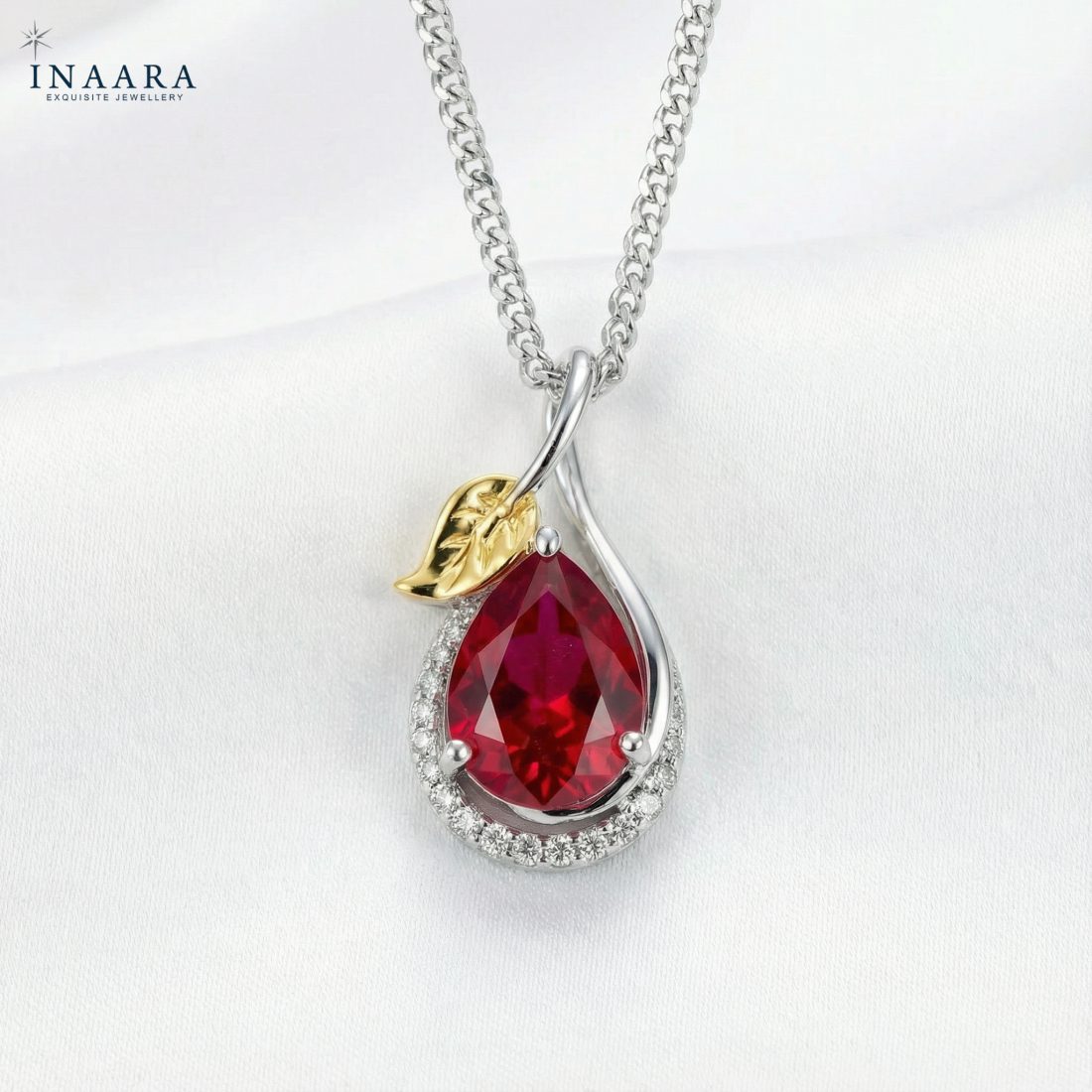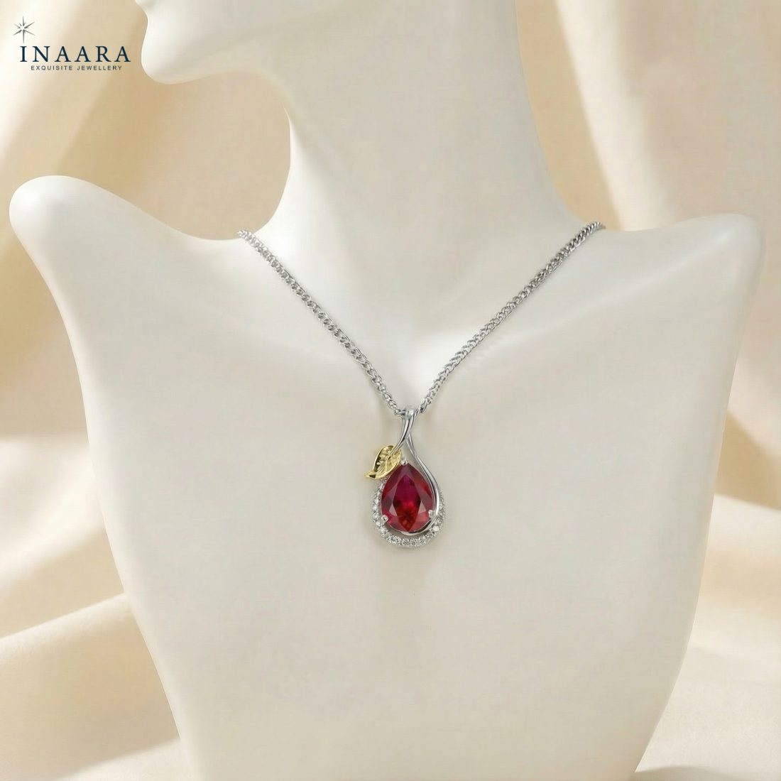 A luminous drop of passion, suspended in timeless elegance. The Imperial Tear Pendant showcases a rich, glowing centerpiece encircled by a fine halo of brilliance, delicately set in radiant silver with a gentle touch of golden warmth. Graceful yet commanding, this design captures light with effortless poise.