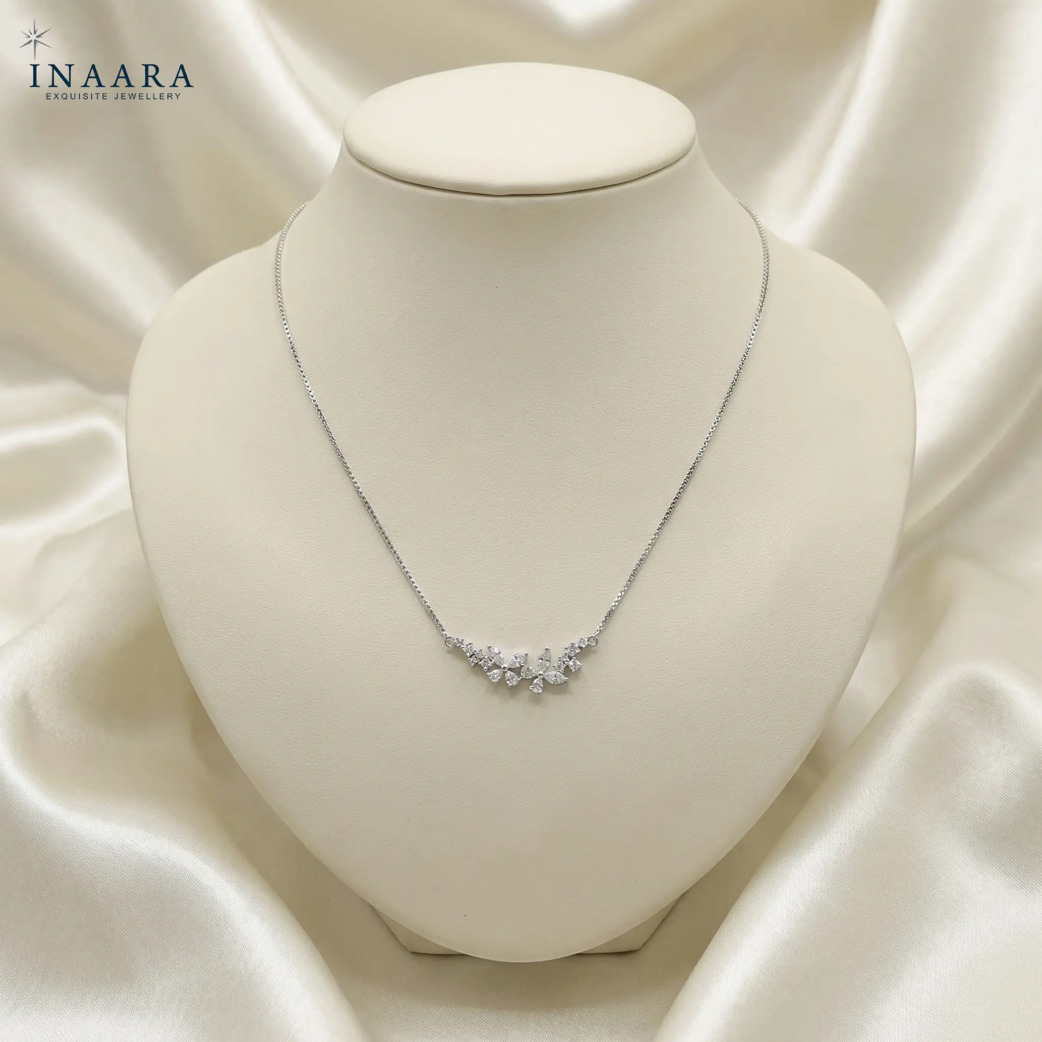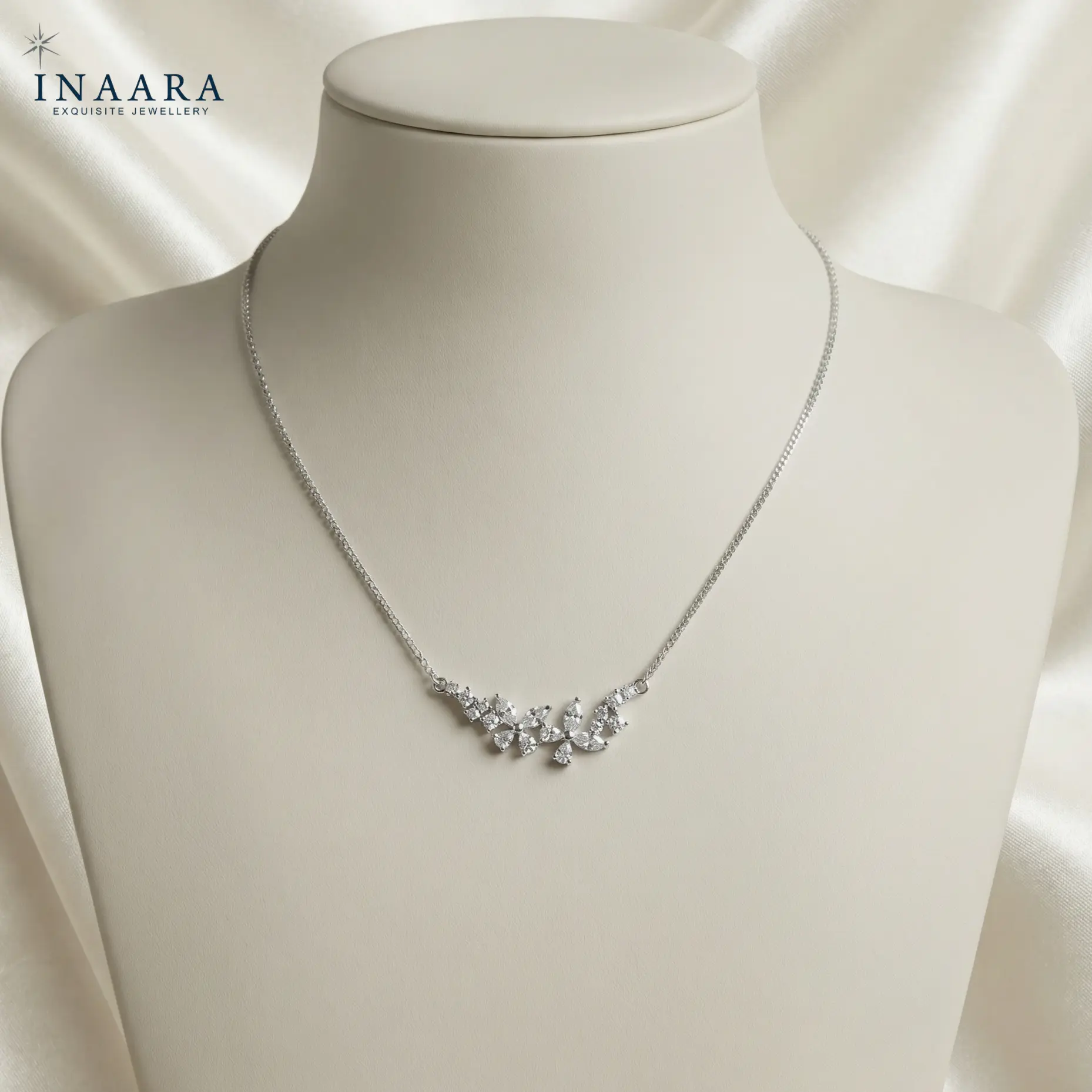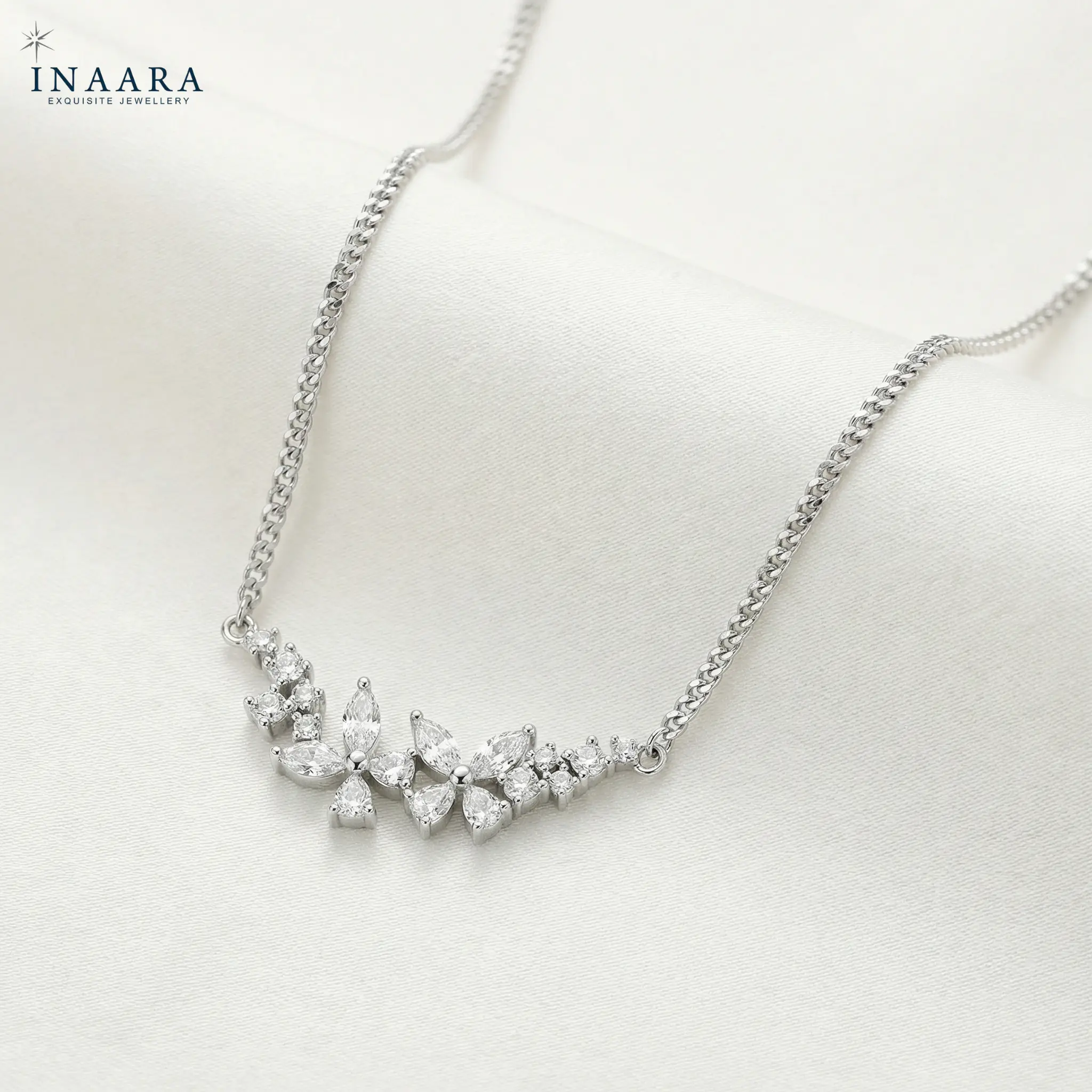 An ode to quiet elegance, this pendant captures the poetry of nature refined into pure luxury. Delicate marquise-cut stones bloom gracefully along a sleek silver chain, creating a soft, luminous silhouette that rests effortlessly on the skin. Each sparkle feels intentional—never loud, always captivating—designed for women who appreciate understated opulence and timeless beauty. Lightweight yet striking, this piece elevates even the simplest look, making it feel polished, feminine, and undeniably premium—like a signature you wear, not just jewellery.