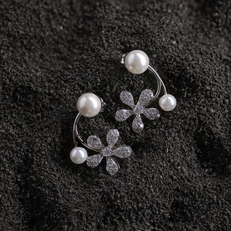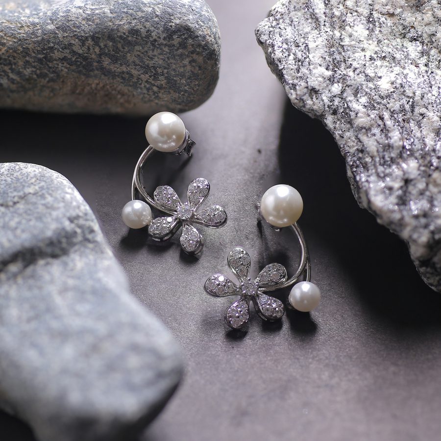 Indulge in the soft poetry of elegance with these exquisite floral pearl earrings. Each piece blooms with shimmering petals, delicately handset to capture light with every turn. Paired with luminous pearls that glow like drops of moonlight, this design creates a perfect harmony of grace and sophistication. Crafted to feel effortlessly elite, this pair adds a whisper of romance and a touch of timeless luxury to any look — the kind of beauty that makes every woman feel unforgettable.
