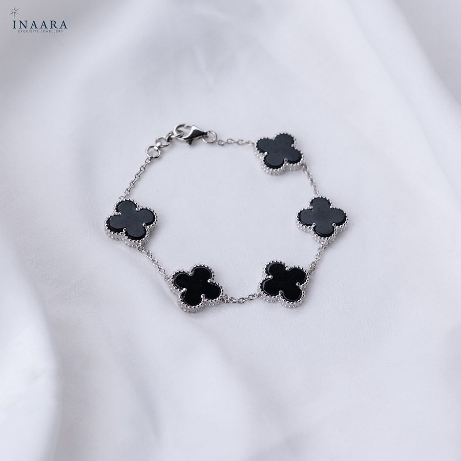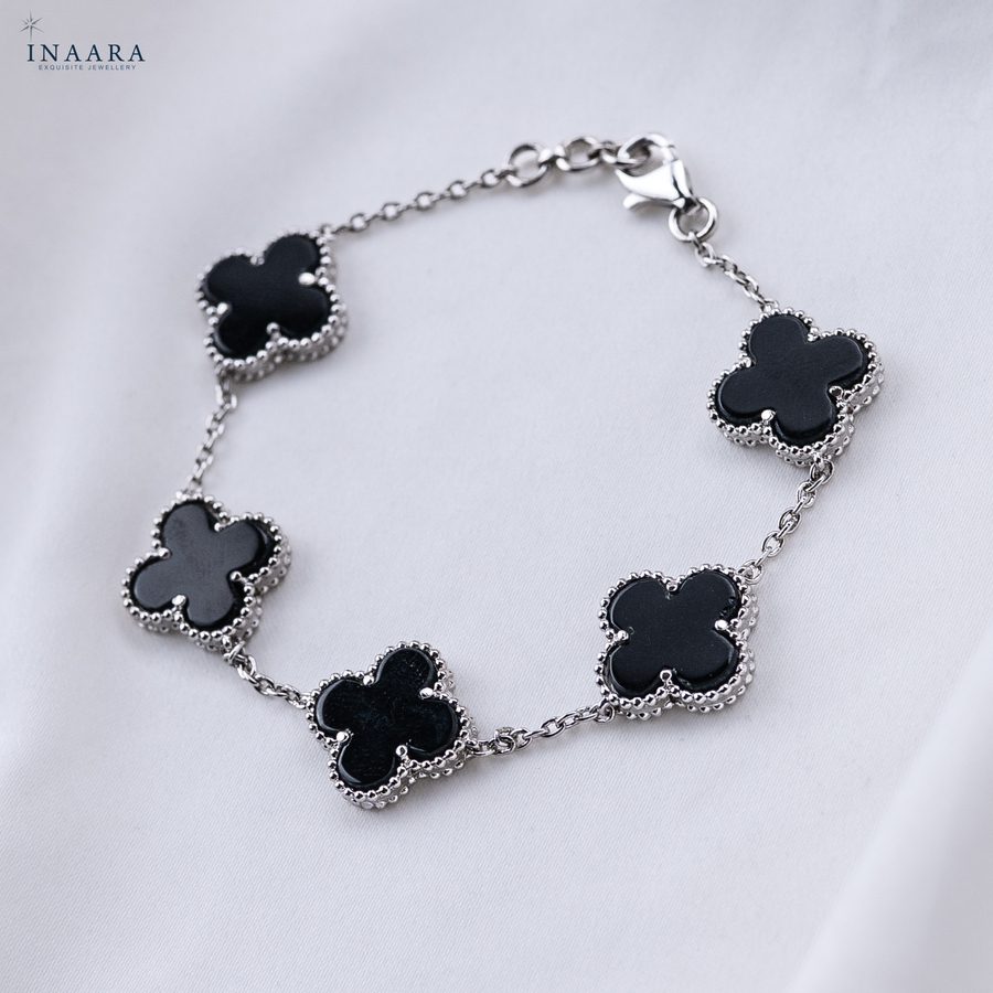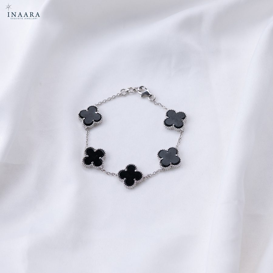 A symbol of grace and quiet confidence — the Noira Bracelet by INAARA exudes refined sophistication. Each onyx-inspired clover is framed in delicate beaded silver detailing, symbolizing luck, elegance, and enduring charm. Its sleek contrast of black and silver exudes quiet confidence — perfect for the woman who defines her own version of luxury.