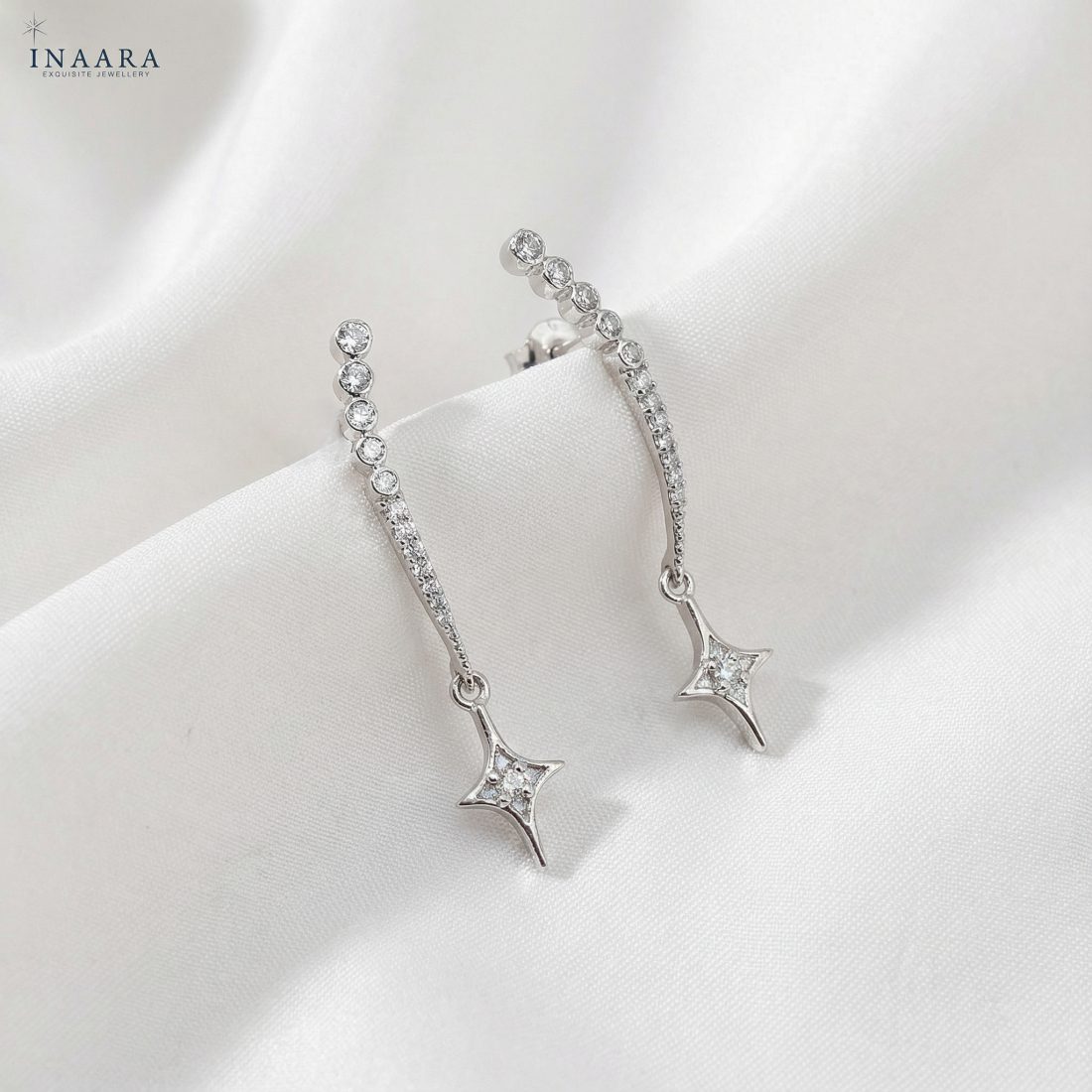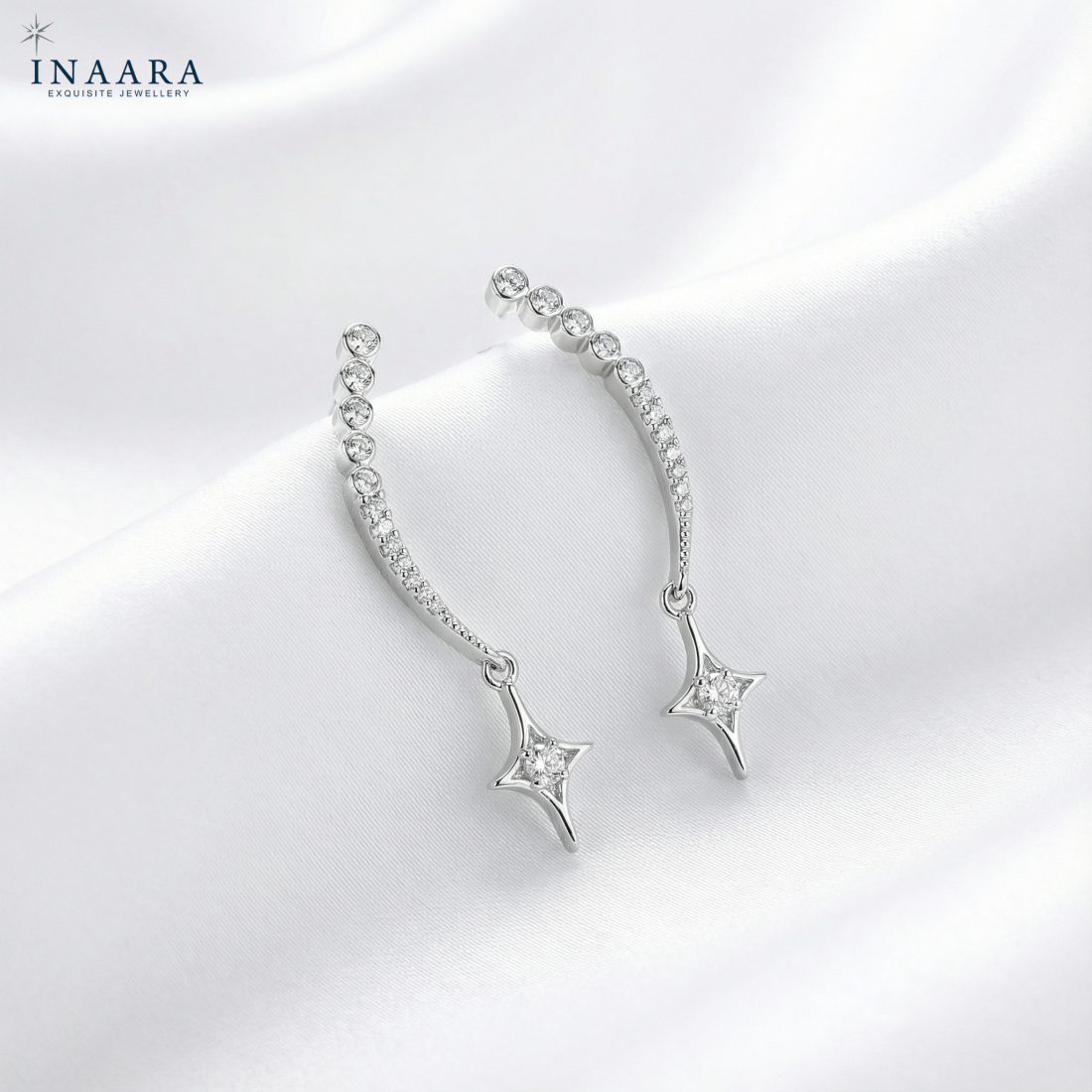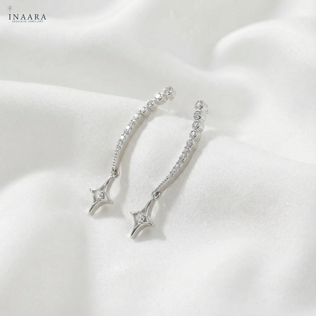 A graceful cascade of light, the Starfall Glow Earrings are designed to shimmer with every movement. Fine lines of brilliance lead to a delicate star-shaped drop, creating a look that feels both celestial and timeless. Crafted in luminous silver, these earrings frame the face with soft radiance and quiet sophistication.