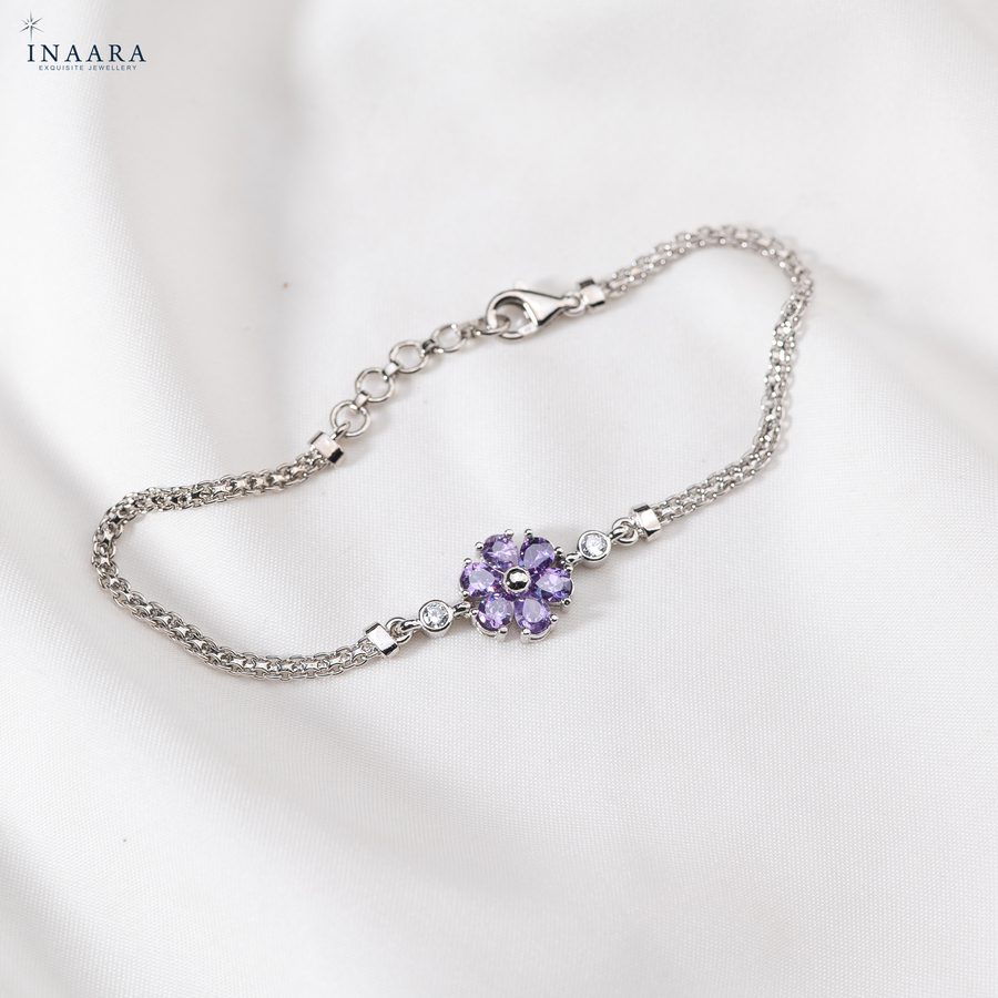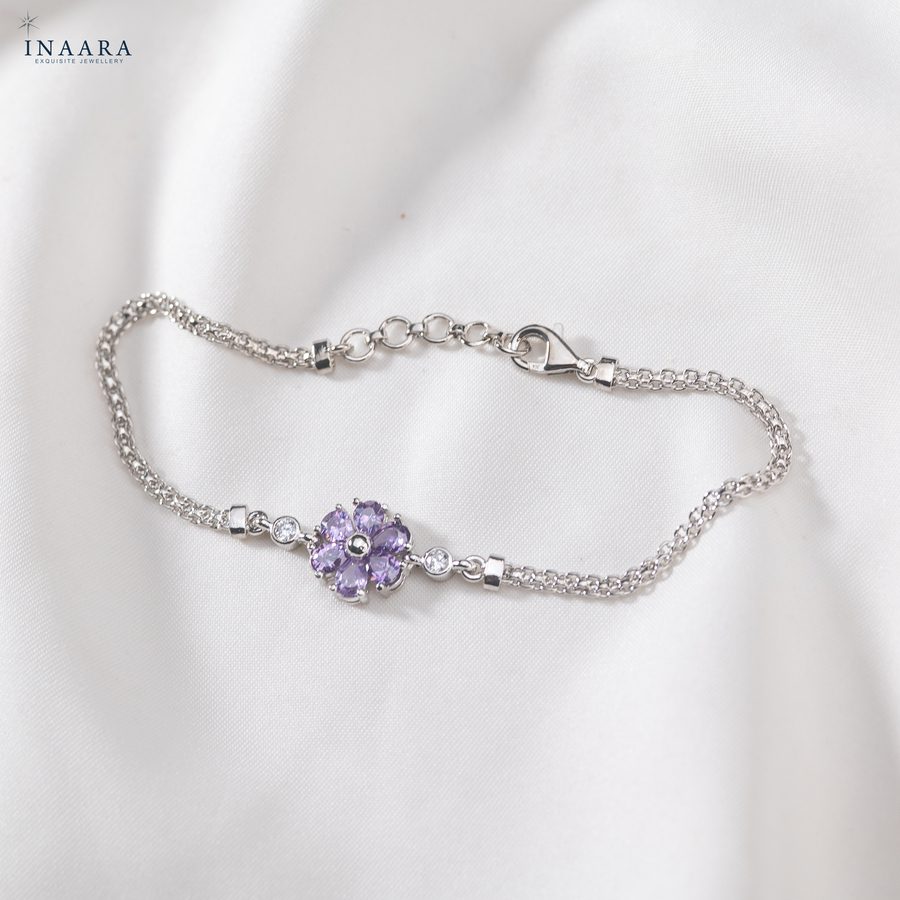 Inspired by delicate petals kissed by morning light, this bracelet celebrates femininity in its purest form. The lilac-toned stones bloom at the center, surrounded by a graceful dual-chain that drapes beautifully on the wrist. Soft, romantic, and enchantingly luxurious — a whisper of beauty she’ll want to wear every day.